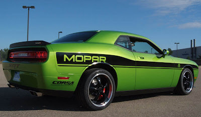 The Dodge Challenger Targa is a full-blown competition car that raced and completed the infamous Targa Newfoundland race this year. "Samantha" started life as a Mopar Challenger drag race package car. Many features were borrowed from the Dodge Viper, but the most noticeable is the snakeskin green paint. To keep the front end down, a Mopar chin spoiler "Splats" developed in a full scale wind tunnel, was added to the front of the car. Mopar gauges keep a close eye on the vital signs.